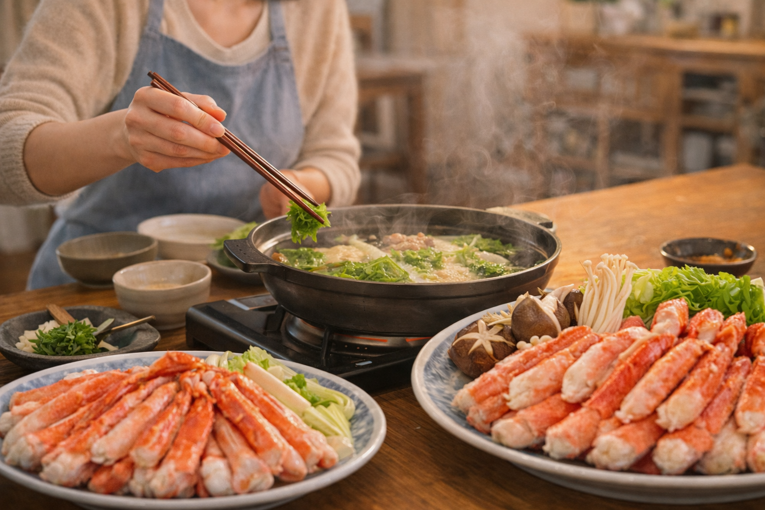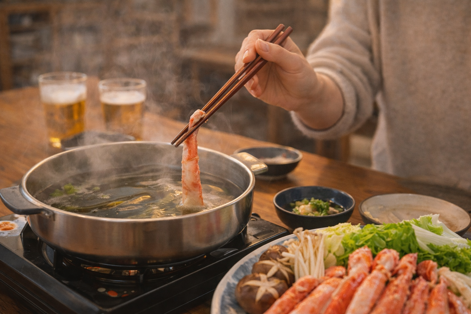 鍋は野菜の準備もあるので、カニは手間を減らすと全体がスムーズです。むき身は食べやすさ重視、半むき身は殻の風味も楽しみたい人向き。集まりで会話を止めずに食べたいなら、むき身が向いています。