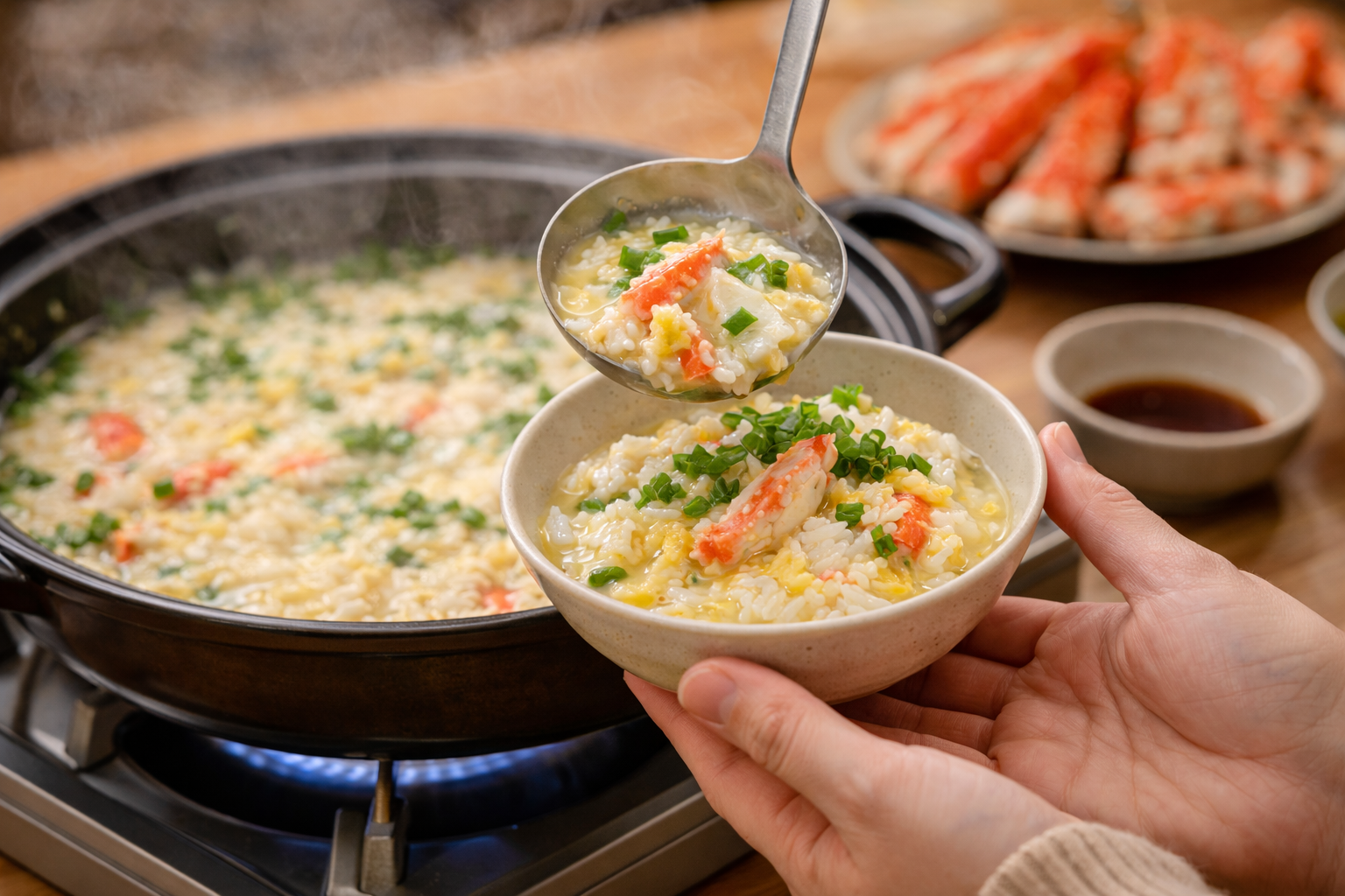 身をほぐして、雑炊・パスタ・炊き込みご飯に。最後までおいしく使い切れるのも、通販蟹を選ぶ価値です。