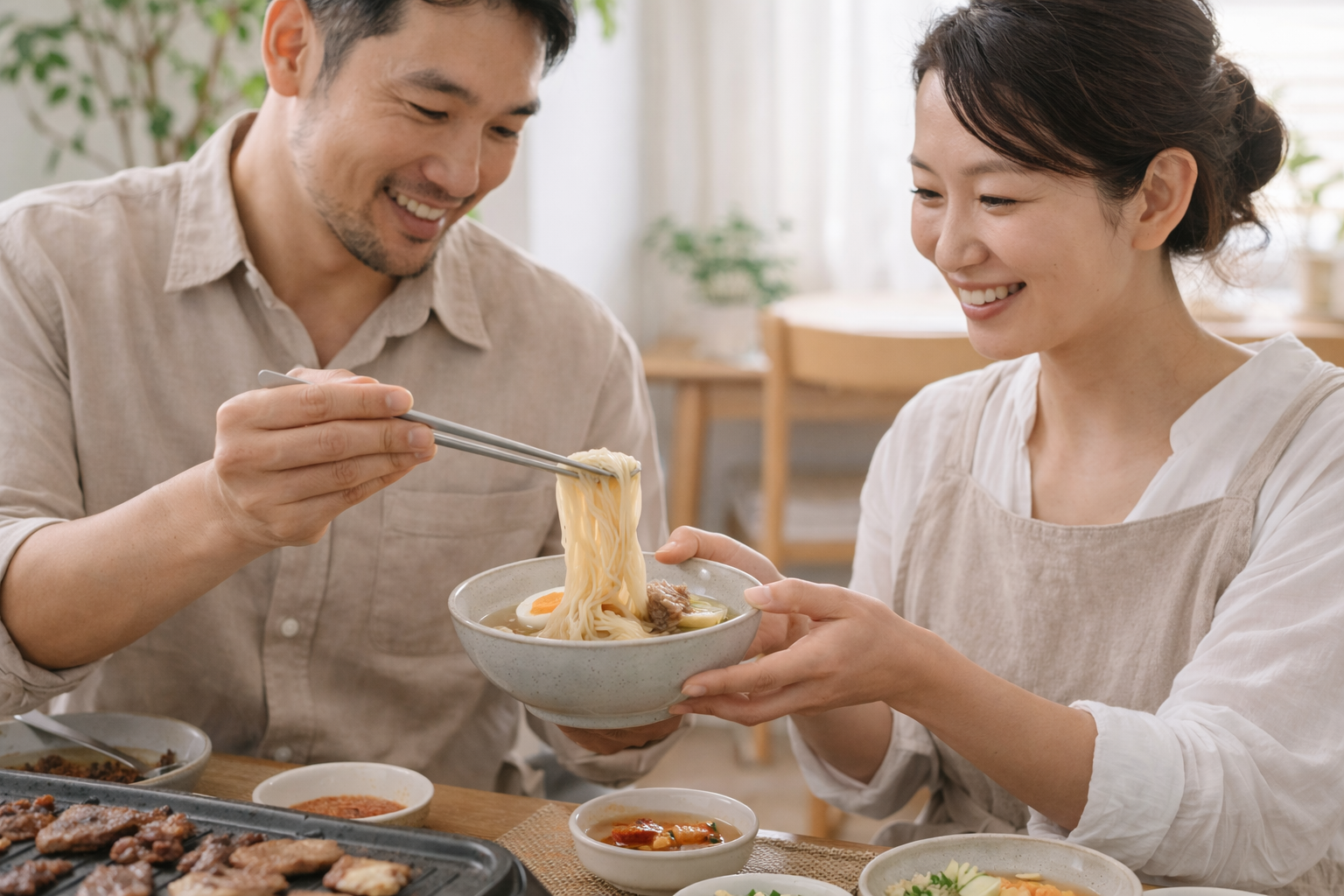 - 外食の満足感を自宅で再現:焼肉と冷麺の組み合わせで、食事の流れまで作れます。